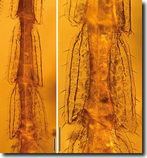 | Abb. 3: Mikroskopische Details der membranartigen seitlichen Ausstülpungen an verschiedenen Körpersegmenten der in Bernstein eingeschlossenenen Phasmatide E. stictum. (Aus Chen et al. 2018, Abdruck mit freundlicher Genehmigung von Ren Dong) |
